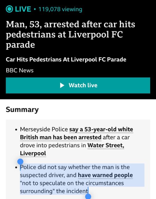 Pub Bigot" wrote: ↑26 May 2025, 21:43Jaan Kenbrovin" wrote: ↑26 May 2025, 21:41 Doesn't seem to be an actual terror attack. The bloke in the car looks like he was getting attacked before he drove through the crowd, and he bibs his horn before he ploughed through.If that’s the case there will be some sort of CCTV to back that up. I know that area well and would assume it’ll have cameras there which will corroborate whether there was an incident beforehand. However, why I don’t think that’s likely is the footage I’ve seen he ploughs into one group, turns and then speeds up and hits more people.